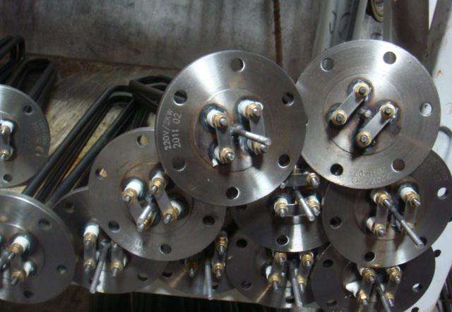 HRY1-護(hù)套式電加熱器(也稱插入式電加熱器):是采用U型管狀電熱元件,依據(jù)加熱不同介質(zhì)設(shè)計(jì)規(guī)范,按照功率配置要求裝配在法蘭蓋上,插入需加熱物料中,發(fā)熱元件工作時(shí)所發(fā)出的大量熱量傳導(dǎo)給被加熱介質(zhì)使介質(zhì)溫度升高,達(dá)到所需的工藝要求。當(dāng)介質(zhì)溫度達(dá)到工藝要求的設(shè)定值時(shí),控制系統(tǒng)根據(jù)溫度傳感器信號(hào),經(jīng)PID運(yùn)算后調(diào)節(jié)電加熱器輸出功率,對(duì)發(fā)熱元件的電阻性負(fù)載實(shí)現(xiàn)溫度控制。使介質(zhì)溫度均勻,達(dá)到所需要求;當(dāng)發(fā)熱元件超溫或低液位時(shí),發(fā)熱元件的聯(lián)鎖保護(hù)裝置立即切斷加熱電源避免發(fā)熱元件燒壞,延長(zhǎng)使用壽命。法蘭式電加熱器是由多支加熱管焊接在法蘭上集中加熱,主要用于敞開式、封閉式的溶液箱和循環(huán)系統(tǒng)中加熱用。
